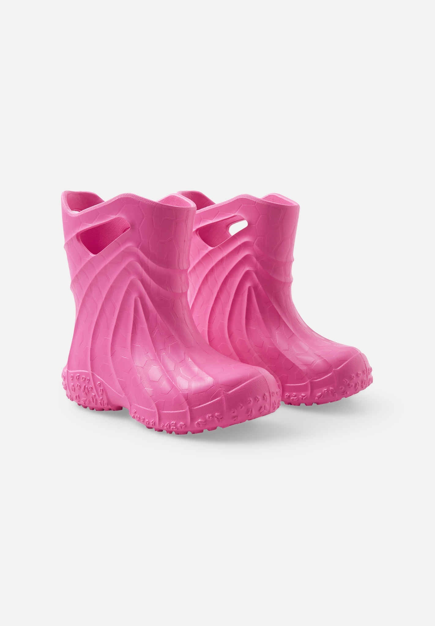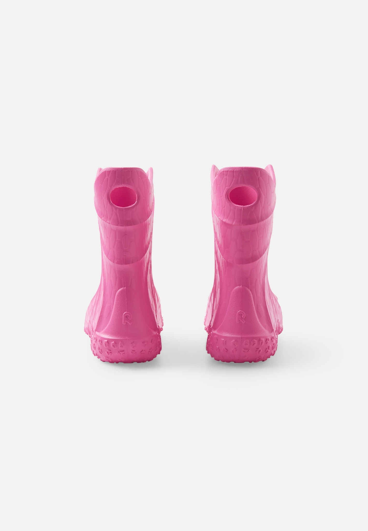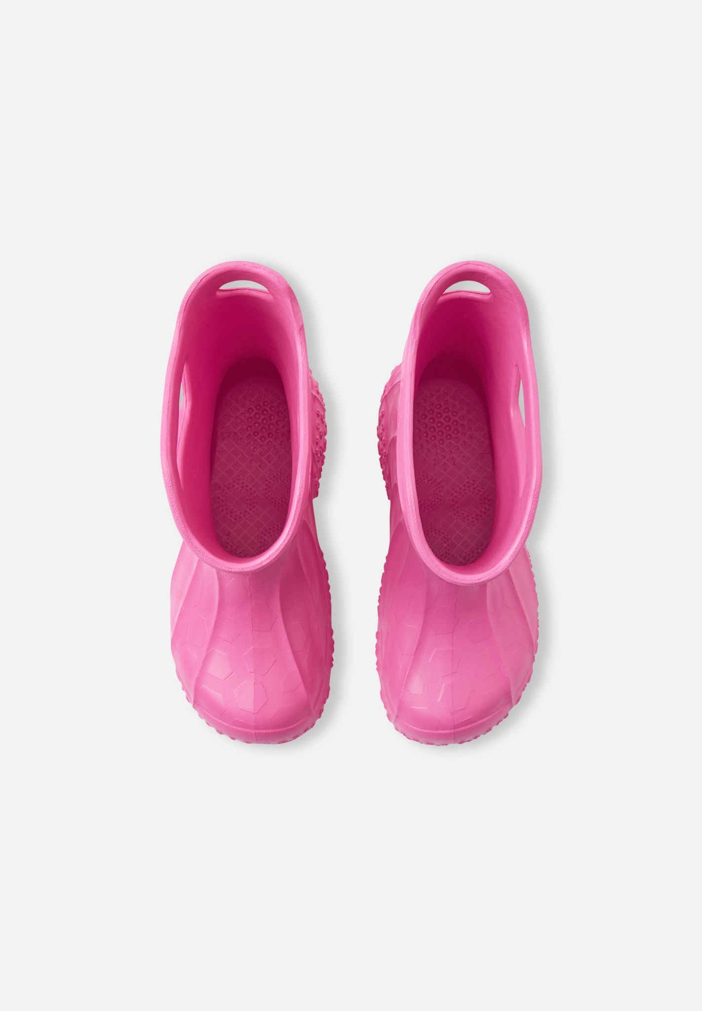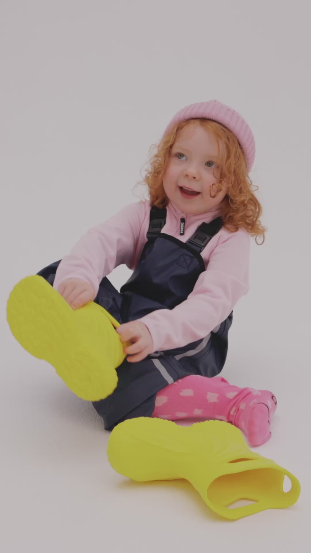 These extremely light rain boots are a joy to pull on, and the wide last lets kids' toes grow straight. They are available in yellow, pink, green, navy, and denim blue! Note the space for rain pants' foot loops in front of the heel.