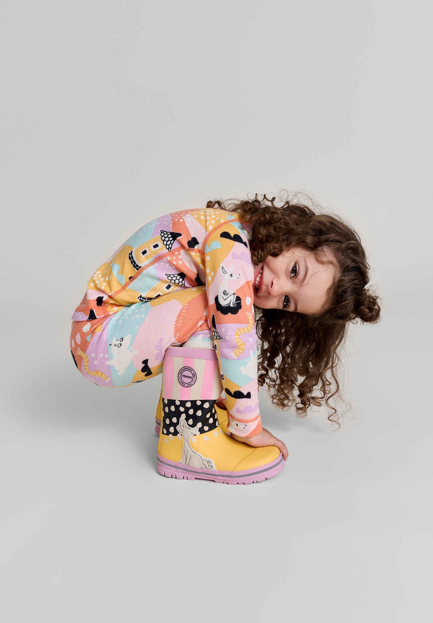 Cotton-lined rubber wellies, with Reima Happy Fit insole for easily checking the size. The cute Moomin rain boots are available in pink/yellow and blue/orange!