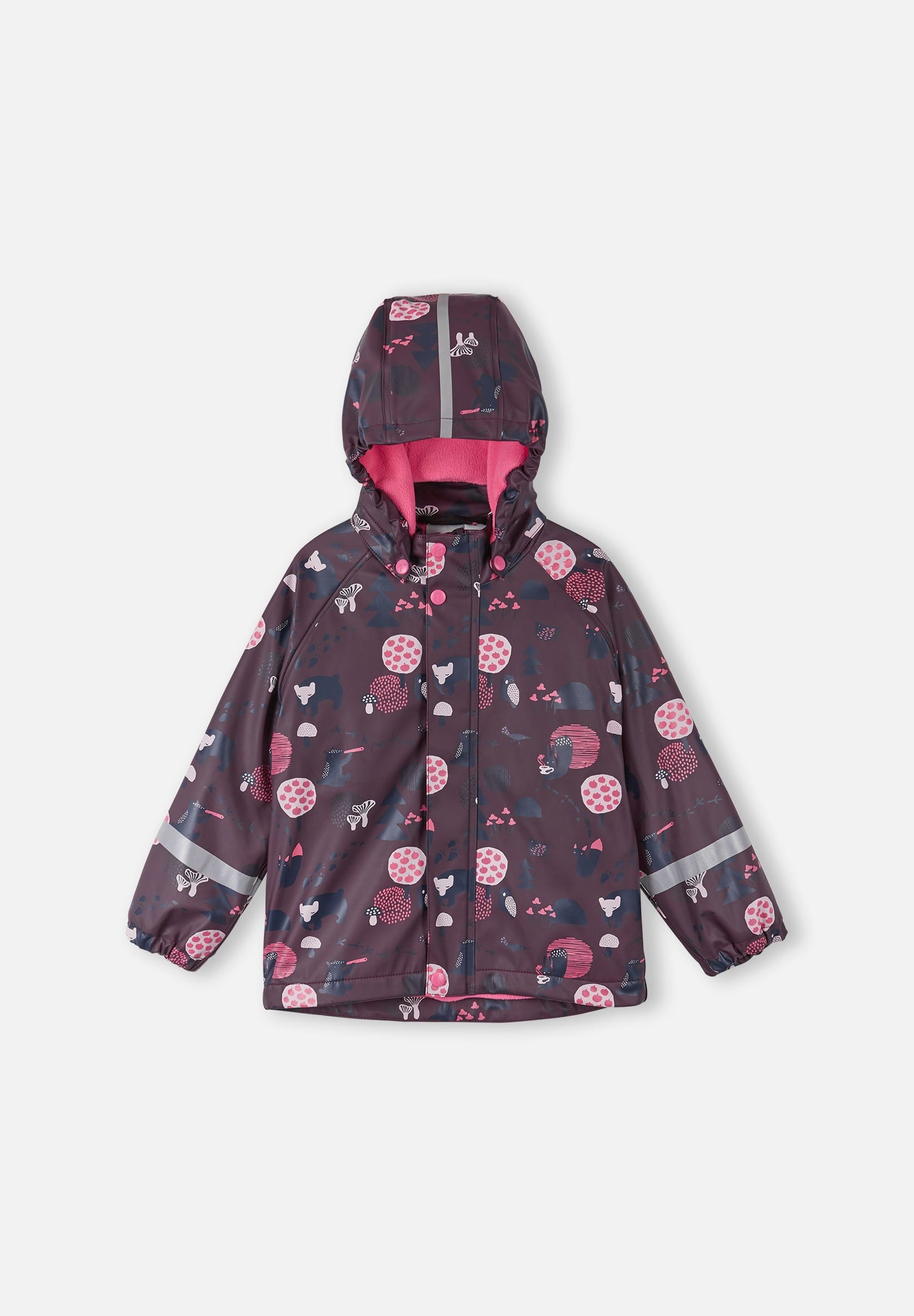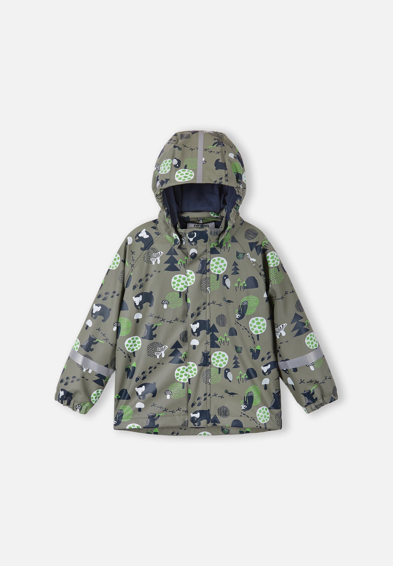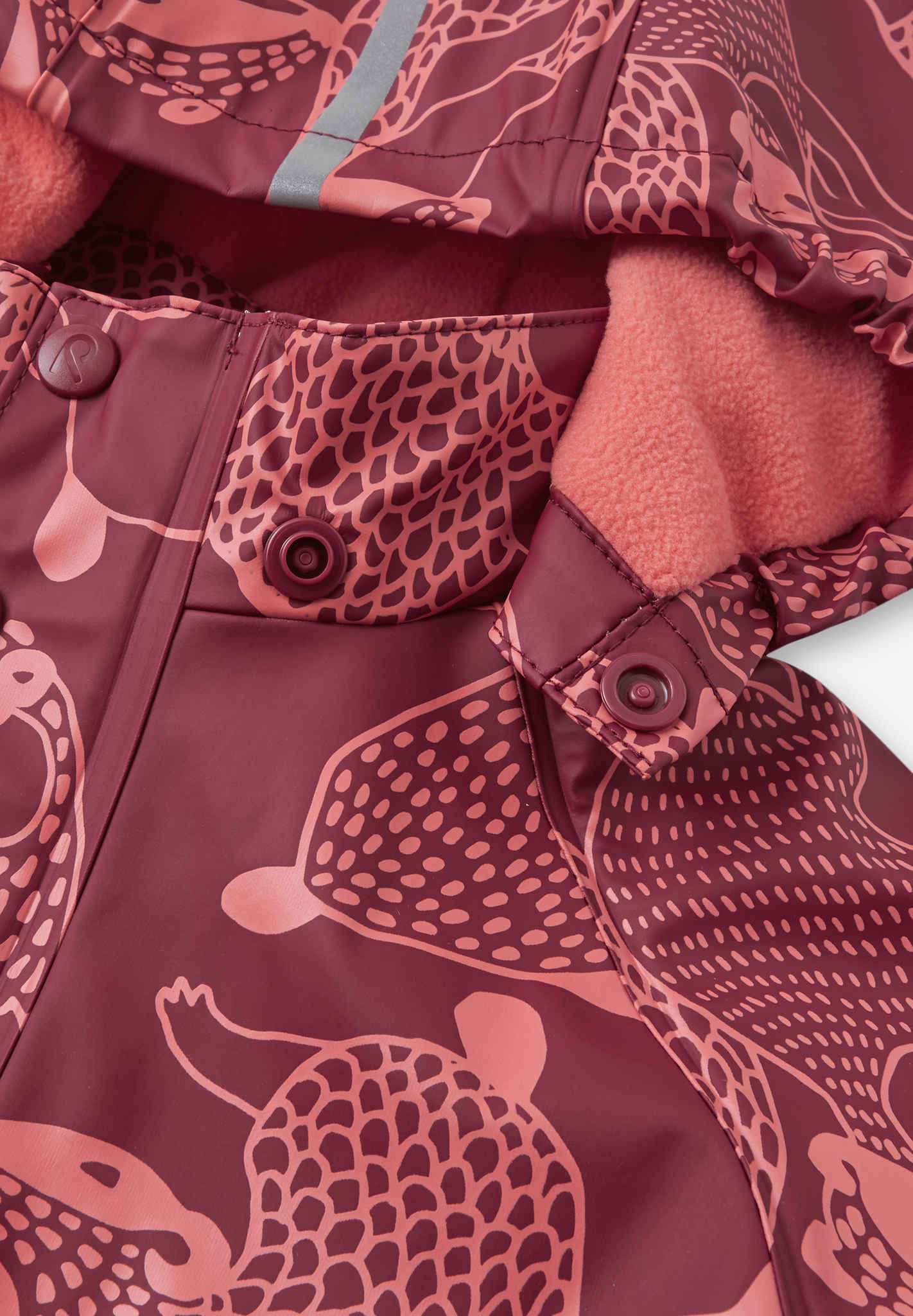 [--Read More--]This kids' warm rain jacket comes with a comfy fleece lining. It's made from a flexible material that doesn't harden in the frost. By adding extra layers for additional cosiness, you get a rain jacket for all year around. Its seams have been welded waterproof so that no rain gets through to skin. The detachable hood is safe during active outings and is attached with snap buttons that come off easily if it gets caught on something. This rain jacket for kids has elasticated cuffs and reflective details on the sleeves and hood. All Reima rainwear is made from a soft material without PVC.