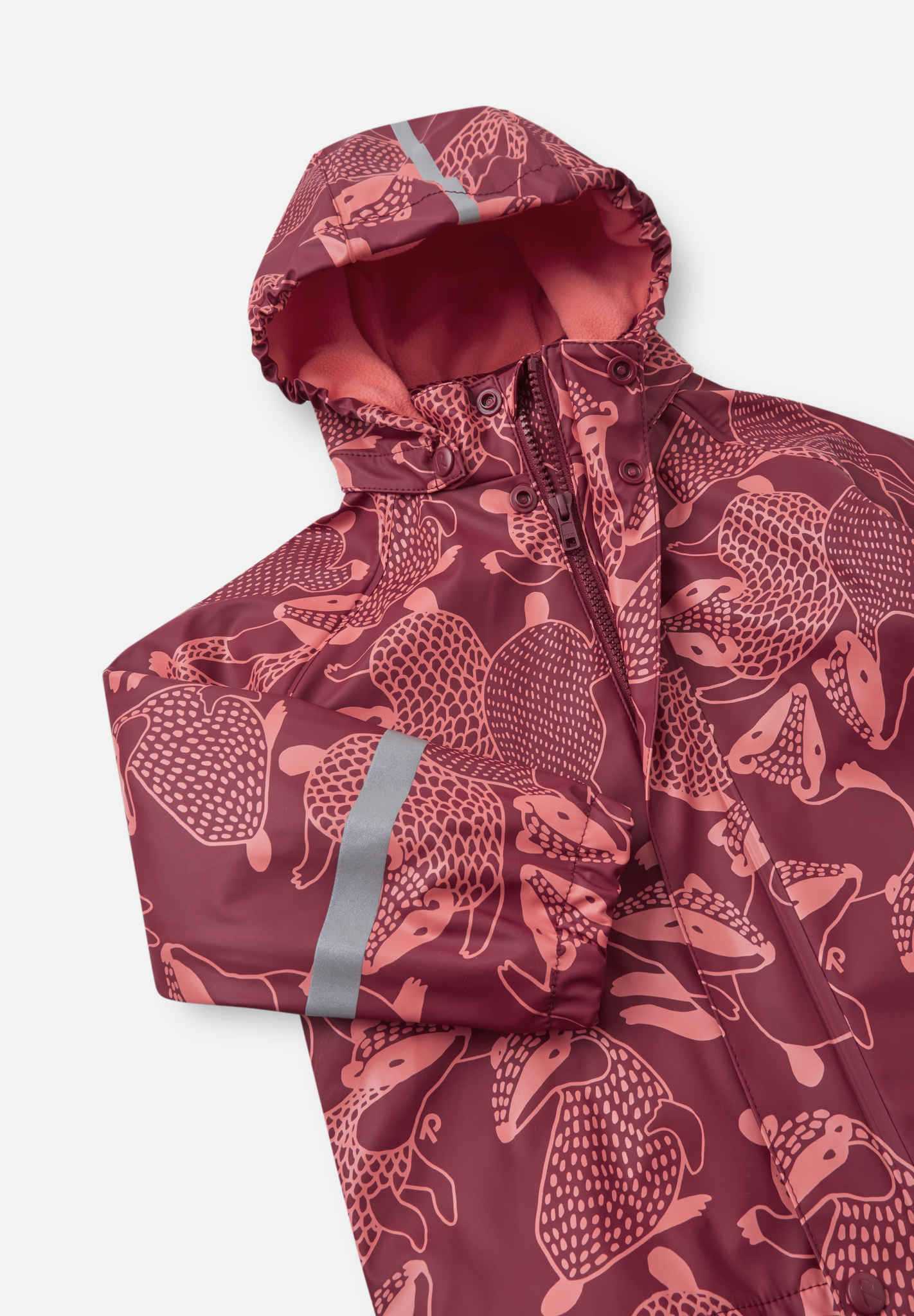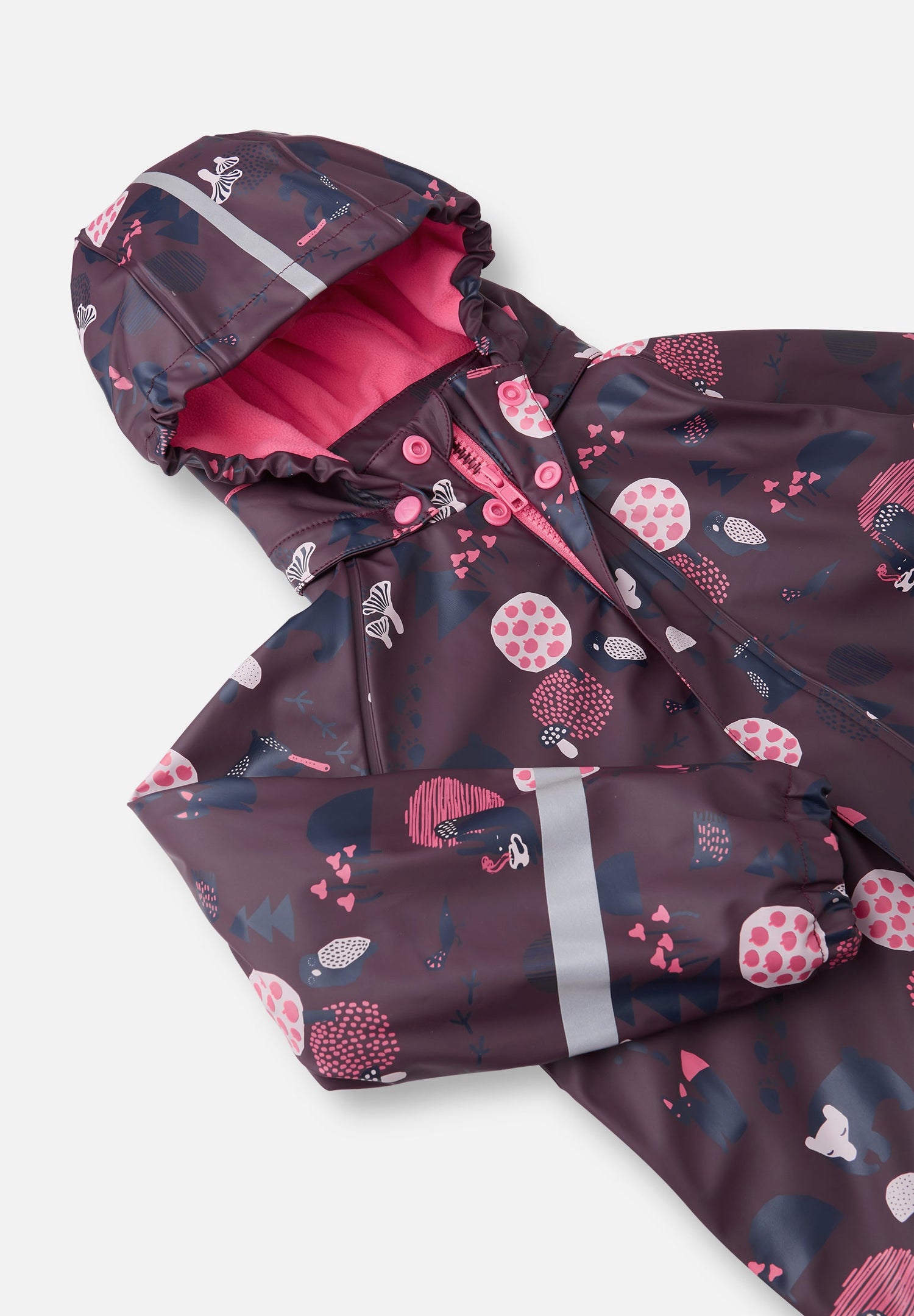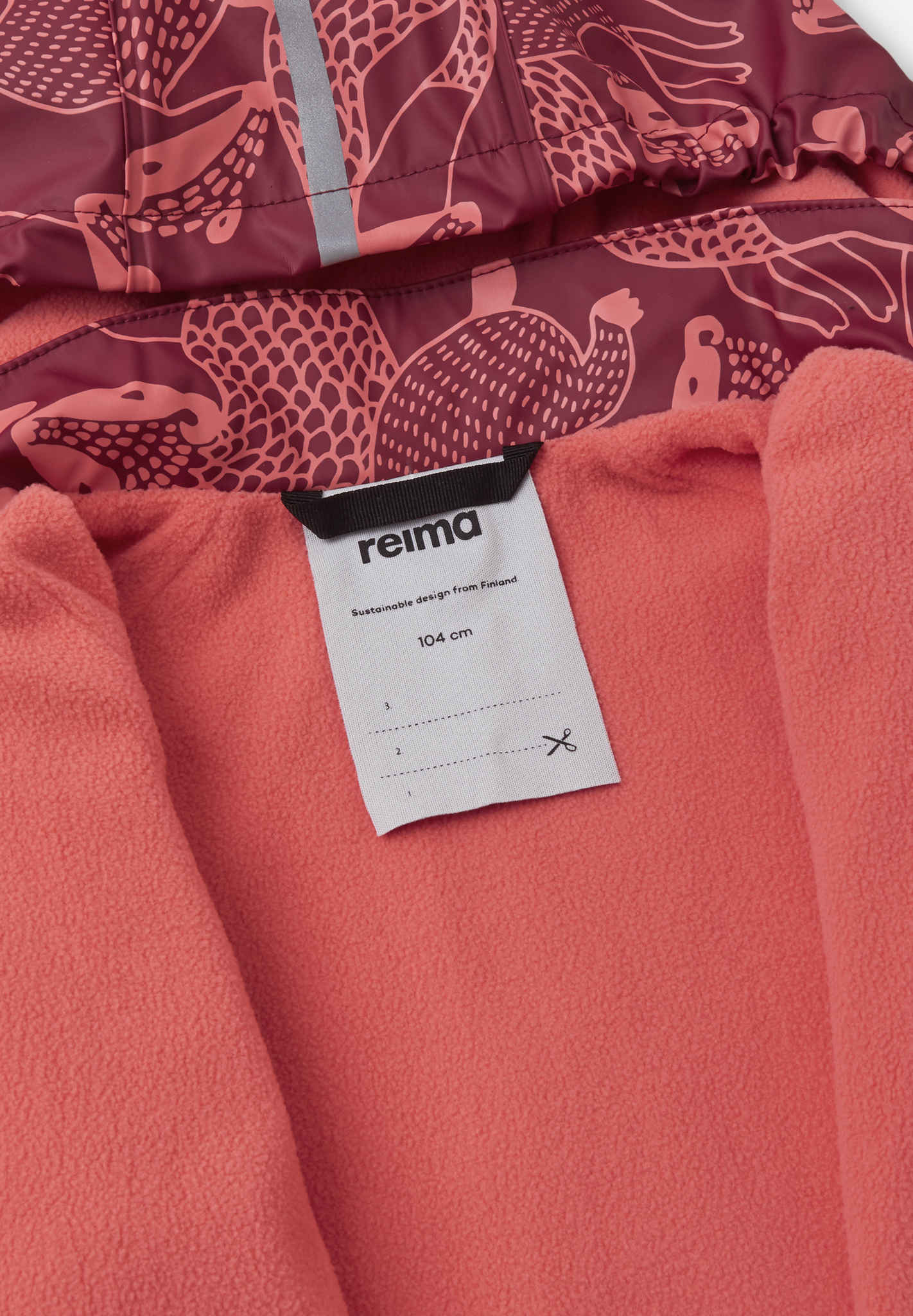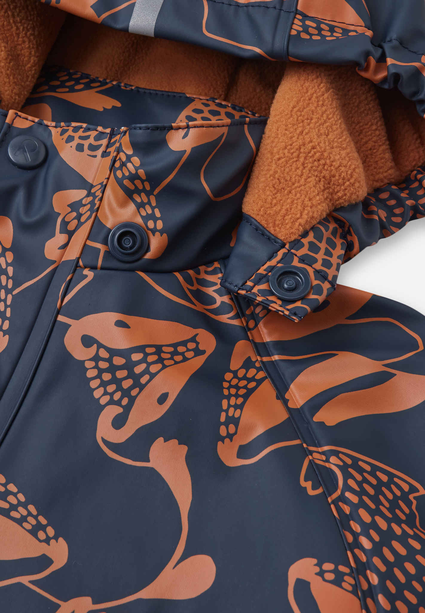 [--Read More--]This kids' warm rain jacket comes with a comfy fleece lining. It's made from a flexible material that doesn't harden in the frost. By adding extra layers for additional cosiness, you get a rain jacket for all year around. Its seams have been welded waterproof so that no rain gets through to skin. The detachable hood is safe during active outings and is attached with snap buttons that come off easily if it gets caught on something. This rain jacket for kids has elasticated cuffs and reflective details on the sleeves and hood. All Reima rainwear is made from a soft material without PVC.