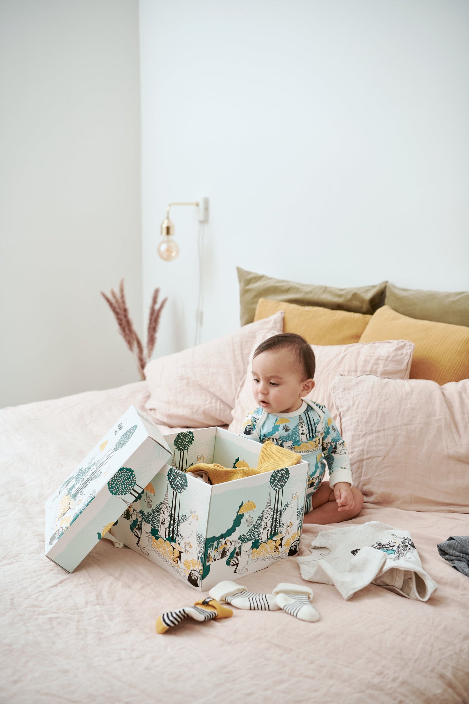 The Moomin Winter Baby Box contains 15 carefully selected baby items in exclusive, unisex Moomin designs, perfect for winter babies!