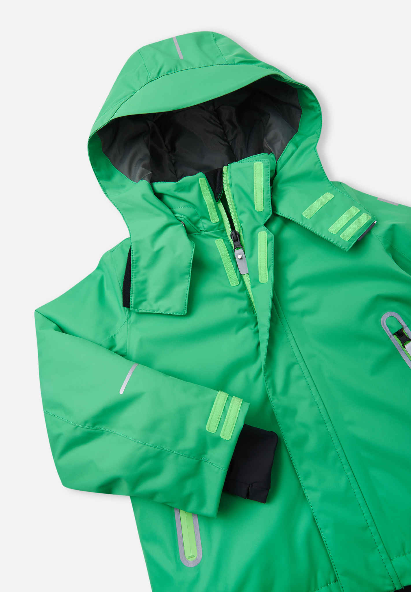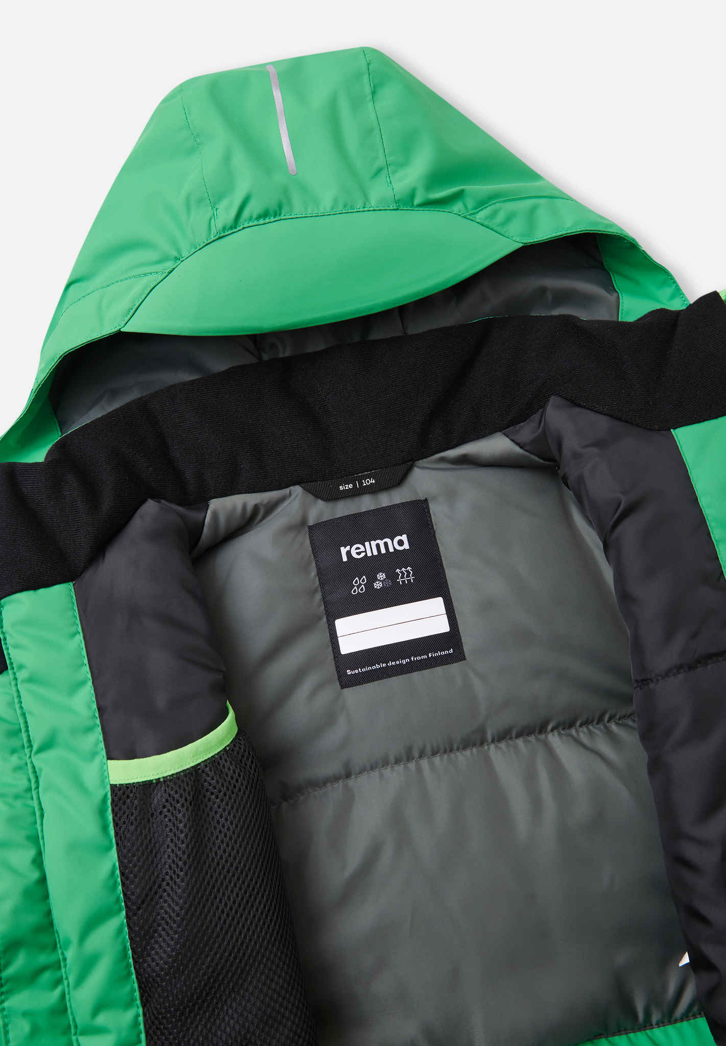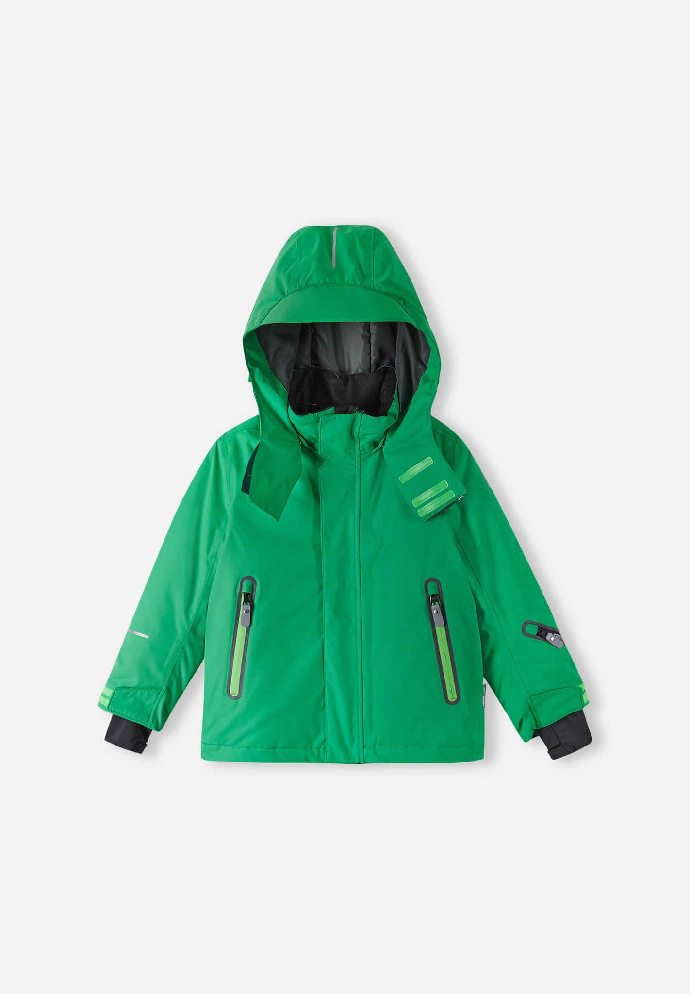 Reimatec kids' ski jacket made with recycled fibers. Several pockets and adjustable features. Extremely water- and windproof as well as breathable. Straight cut.